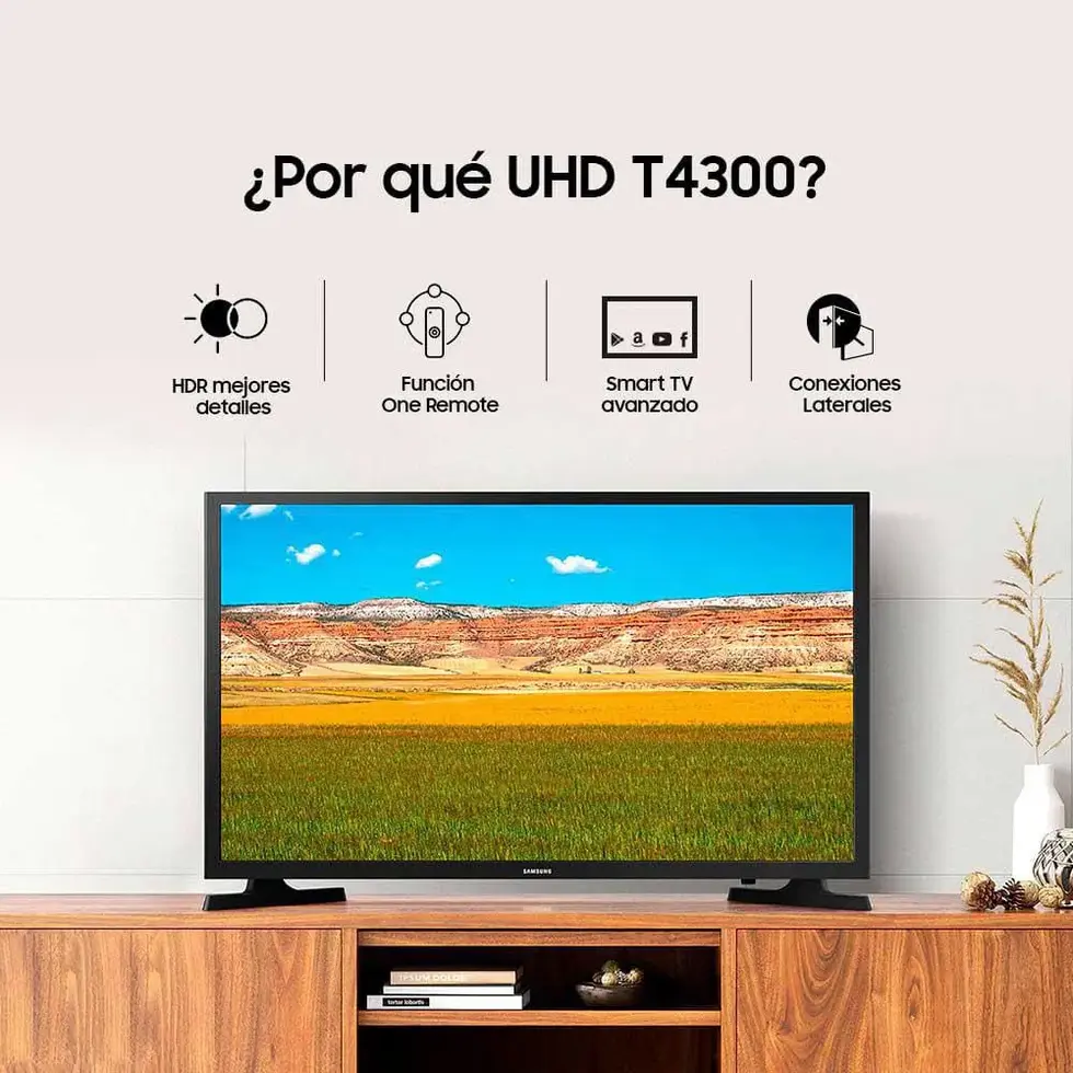 El Samsung T4300 es un televisor inteligente de 32 pulgadas con resolución HD que ofrece una experiencia visual clara y nítida. Con funciones Smart TV, permite acceder fácilmente a tus plataformas de streaming favoritas como Netflix, YouTube y más. Cuenta con tecnología HDR y PurColor para colores más vibrantes, además de conectividad Wi-Fi y múltiples puertos para facilitar la conexión con otros dispositivos.